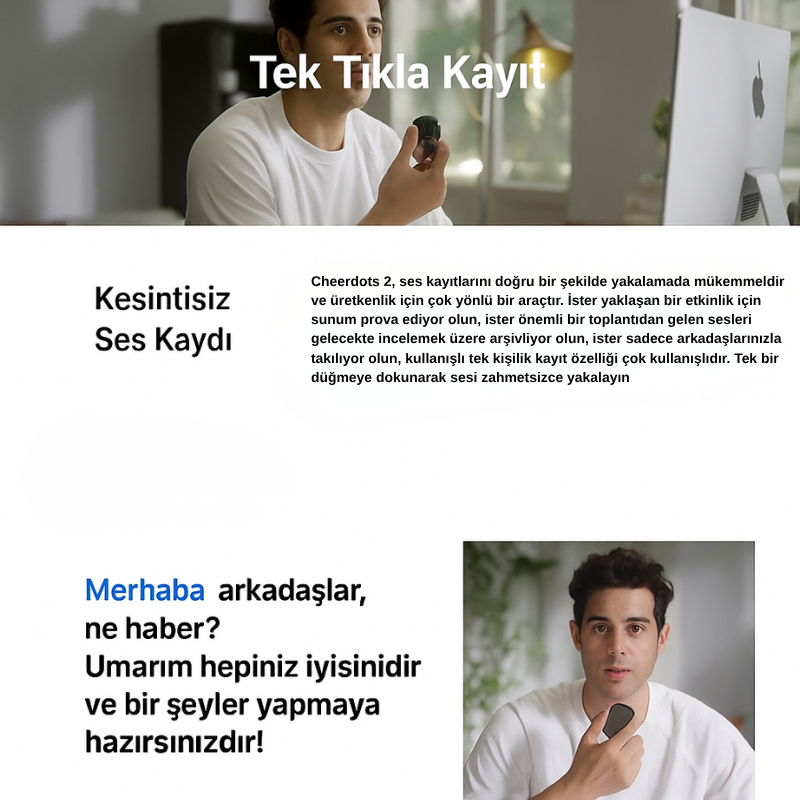 Cheerdots2'nin dinamik PPT kontrol özellikleriyle sunumlarınızı bir üst seviyeye taşıyın. Vurgulama ve kırmızı ışık göstergeleri gibi kullanışlı özelliklerle slaytları sorunsuz bir şekilde kontrol edin ve izleyicilerinizin dikkatini çeken ilgi çekici bir mesaj verin. Her sunumu ustaca yönetmek için fare kontrolü ve sunum modu arasında anında geçiş yapın; lazer işaretçi, spot ışığı ve dijital ışık arasında geçiş yapın.